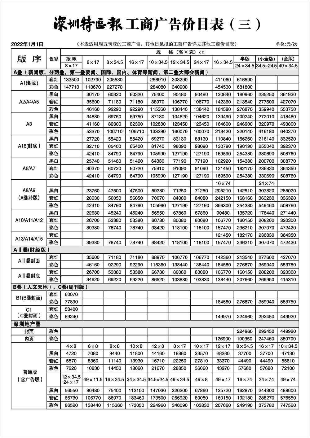 深圳特區(qū)報工商廣告價目表