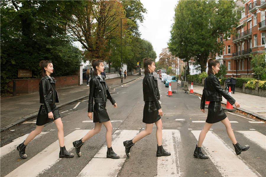 ??? 近日,金晨一組在倫敦的街拍照曝光。照片中,金晨置身于倫敦的艾比路,黑色皮衣搭配短裙大秀美腿,馬丁靴的搭配也更顯前衛(wèi)時髦。與以往或優(yōu)雅或復(fù)古的街拍不同,金晨此次歡脫地模仿起披頭士過馬路的經(jīng)典畫面,一人cos披頭士四位成員,可謂創(chuàng)意十足。而她時不時做出旋轉(zhuǎn)跳躍的高難度的動作,令不少網(wǎng)友紛紛表示:為金晨瘋狂打call。