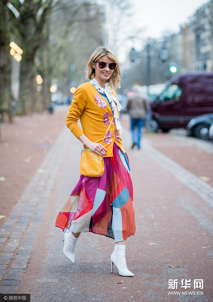 ??? 近日,德國(guó)杜塞爾多夫,時(shí)尚博主Gitta Banko街拍。她戴Miu Miu茶色墨鏡,身穿Steffen Schraut橘色亮片拼貼針織開(kāi)衫,內(nèi)搭Steffen Schraut白色蝴蝶印花系帶雪紡襯衫,Steffen Schraut拼色百褶紗裙,肩背Volker Lang橘色口金包,腳踩Kurt Geiger白色尖頭高跟短靴。