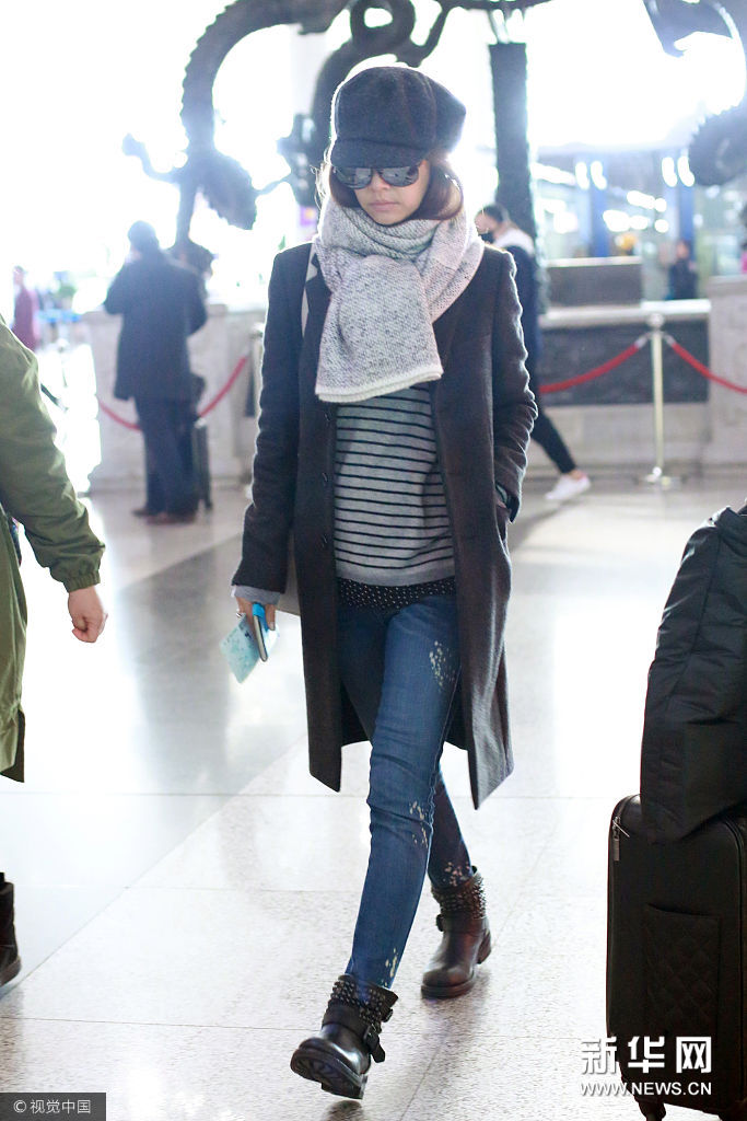 ??? 北京,近日,林心如現(xiàn)身首都機場。 林心如頭戴灰色毛呢報童帽,黑色太陽鏡遮面,身穿黑色毛呢修身毛呢大衣外套,脖帶淺灰色針織圍脖,內(nèi)搭條紋T恤,肩背白色Herems凱莉包,下穿深藍色磨白緊身牛仔褲,腳穿鉚釘平底踝靴。