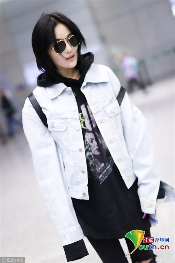 2017年12月13日,上海,張馨予現(xiàn)身機場,穿連帽衣顯清爽,剪短發(fā)架黑超形似王菲,歪頭撩發(fā)又帥又酷。