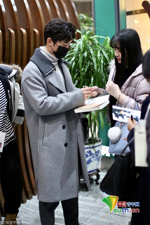 ??2017年12月13日,北京,竇驍身著灰色大衣、戴口罩現(xiàn)身機(jī)場(chǎng),為粉絲大方簽名,見鏡頭開心比V揮手親和力滿分。