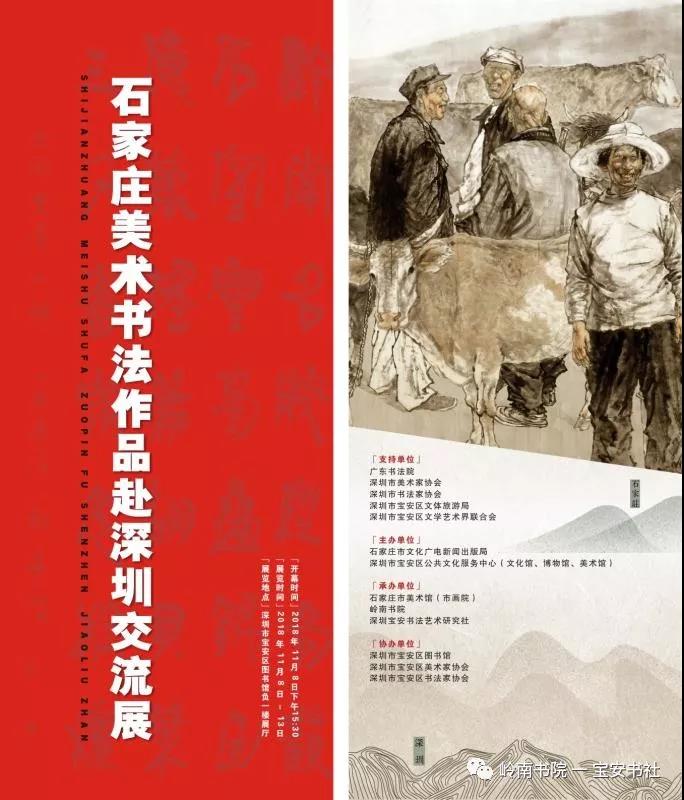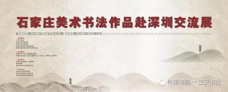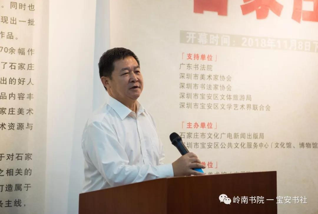 2018年11月8日下午15:00,由石家莊市文化廣電新聞出版局、深圳市寶安區(qū)公共文化服務(wù)中心(文化館、博物館、美術(shù)館)主辦,石家莊市美術(shù)館(市畫(huà)院)、嶺南書(shū)院、深圳寶安書(shū)法藝術(shù)研究社承辦,深圳市寶安區(qū)圖書(shū)館、寶安區(qū)美協(xié)、寶安區(qū)書(shū)協(xié)協(xié)辦并得到深圳市書(shū)法家協(xié)會(huì)、美術(shù)家協(xié)會(huì)、寶安區(qū)文體旅游局、寶安區(qū)文聯(lián)的大力支的 “ 石家莊美術(shù)書(shū)法作品赴深圳交流展 ” 在深圳市寶安區(qū)圖書(shū)館負(fù)一樓展廳隆重開(kāi)幕——