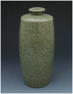 《耀瓷刻花牡丹紋罐》造型飽滿渾圓,而靈秀活潑,敦厚端莊。鼓腹處的纏枝牡丹富貴雍容,刻花刀鋒犀利,線條流暢。滿施的青釉冰潔玉潤(rùn),超凡脫俗。