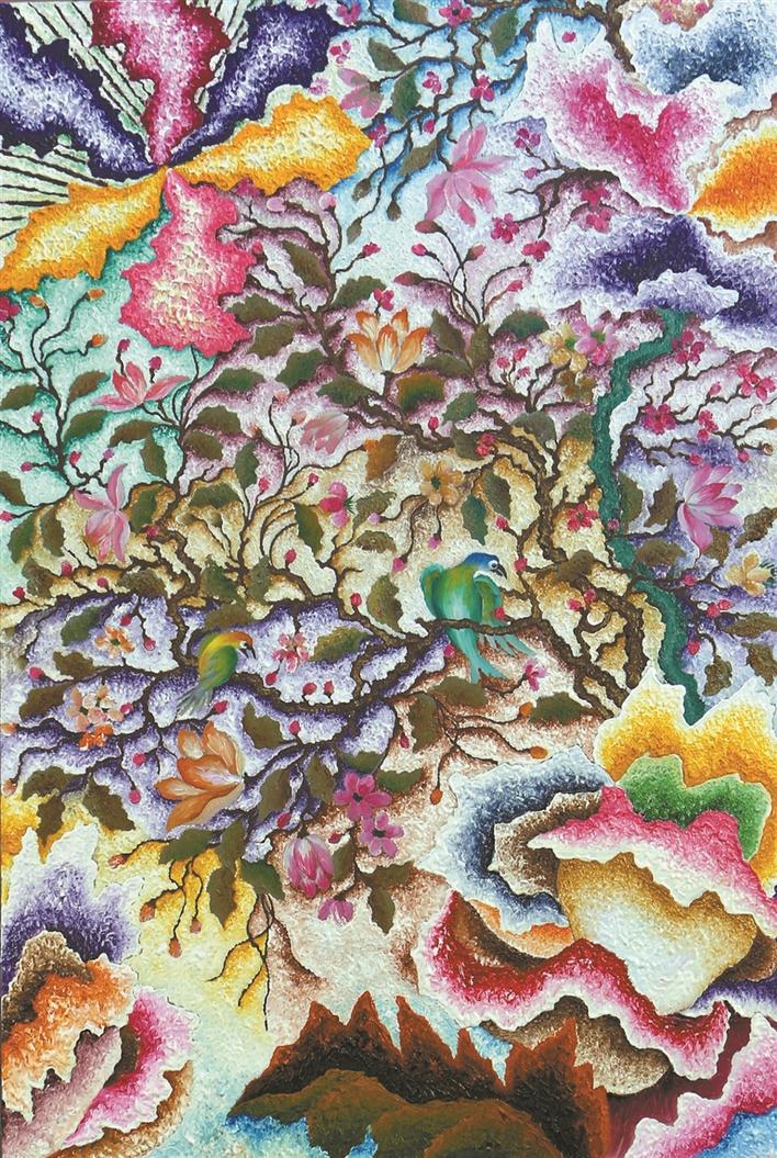色彩是鄭澤生作品的一大亮點。這源自他第一份工作是在深圳增邦印花廠學(xué)調(diào)色,長期的訓(xùn)練和刻苦的努力練就了他對色彩的敏感度?!断诺南愀窭锢愤@組作品可以說是他近期創(chuàng)作中布局最為精細(xì)、顏色最為豐富的代表作之一。畫面布滿圖騰式的形象,萬物共生。此時鄭澤生處理群像時顯現(xiàn)出一派欣欣向榮的景象,每一寸都散發(fā)著生命的光輝和絢爛。