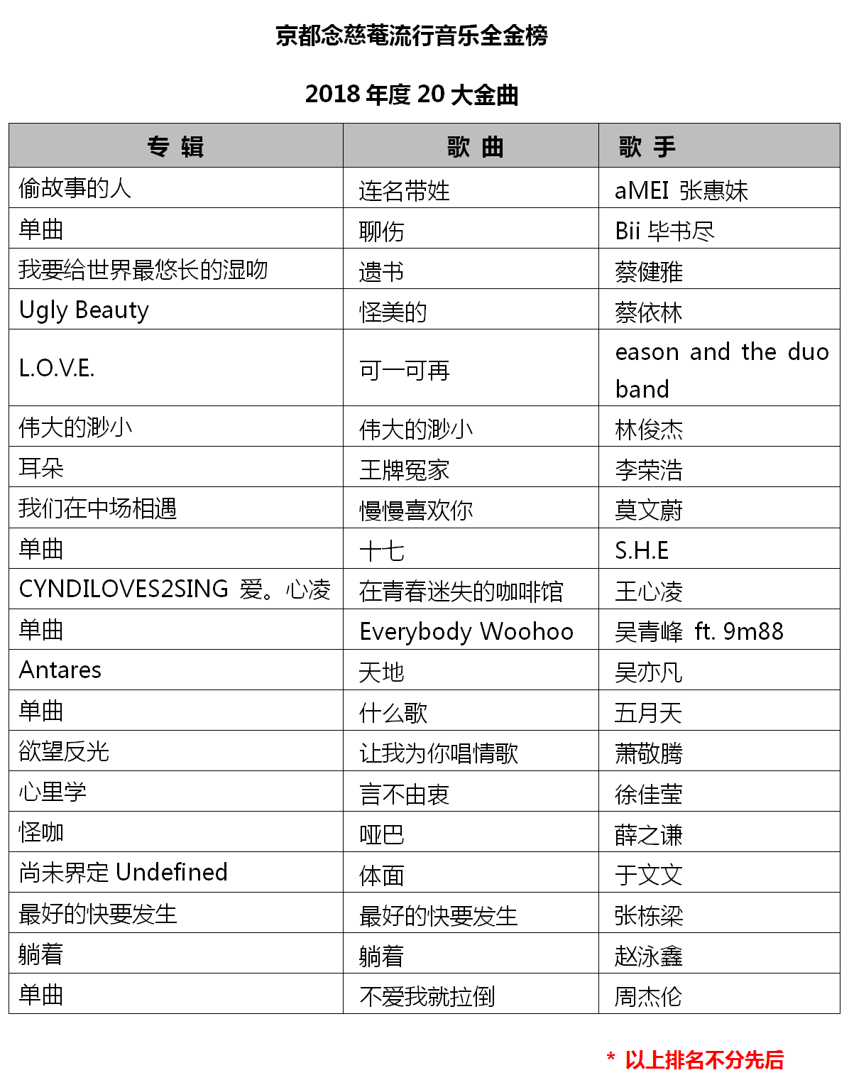 憑著專輯《垂直活著,水平留戀著。》主打歌曲《Forever Young》,在京都念慈菴·流行音樂全金榜榜單中霸榜十周的艾怡良,實力入圍“年度最受歡迎創(chuàng)作歌手”。除此外,毛不易、趙泳鑫、陳綺貞、蕭秉治、于文文、白安、王笠人均有入圍。