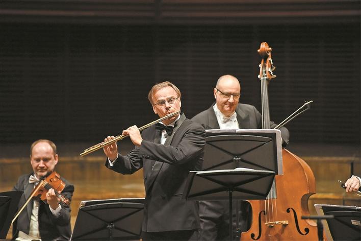 長笛大師安德烈· 格里米內(nèi)利與意大利愛樂獨(dú)奏家室內(nèi)樂團(tuán)音樂會。 深圳特區(qū)報(bào)記者 胡蕾 攝
