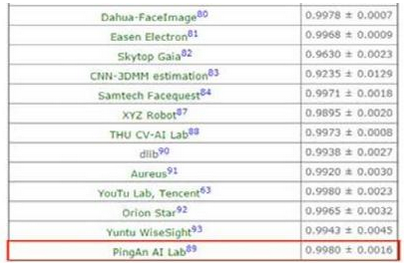 5月9日,國際權(quán)威人臉識別數(shù)據(jù)庫LFW(Labeled Faces in the Wild)最新公布的測試結(jié)果顯示,平安集團(tuán)旗下平安科技的人臉識別技術(shù)以99.8%的識別精度和最低的波動幅度領(lǐng)先國內(nèi)外知名公司,位居世界第一。該精度為LFW所公布的最佳成績,也是平安科技人工智能實驗室取得的里程碑式成果。此外,經(jīng)國家公安部第三研究所認(rèn)證中心權(quán)威認(rèn)證,平安科技人臉識別技術(shù)同樣獲得識別精度99.84%的檢測結(jié)果,并榮獲檢測報告證書。