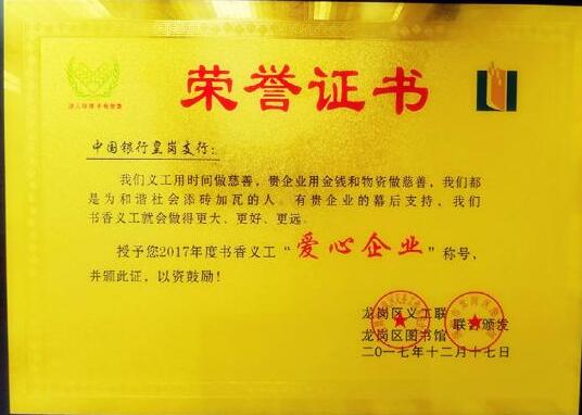 深圳新聞網(wǎng)訊 近日,深圳市龍崗區(qū)義工聯(lián)、龍崗圖書館書香義工2017年度總結(jié)大會在龍崗區(qū)文體中心召開。大會授予中國銀行深圳皇崗支行書香義工“愛心企業(yè)”稱號,并聯(lián)合頒發(fā)榮譽證書。