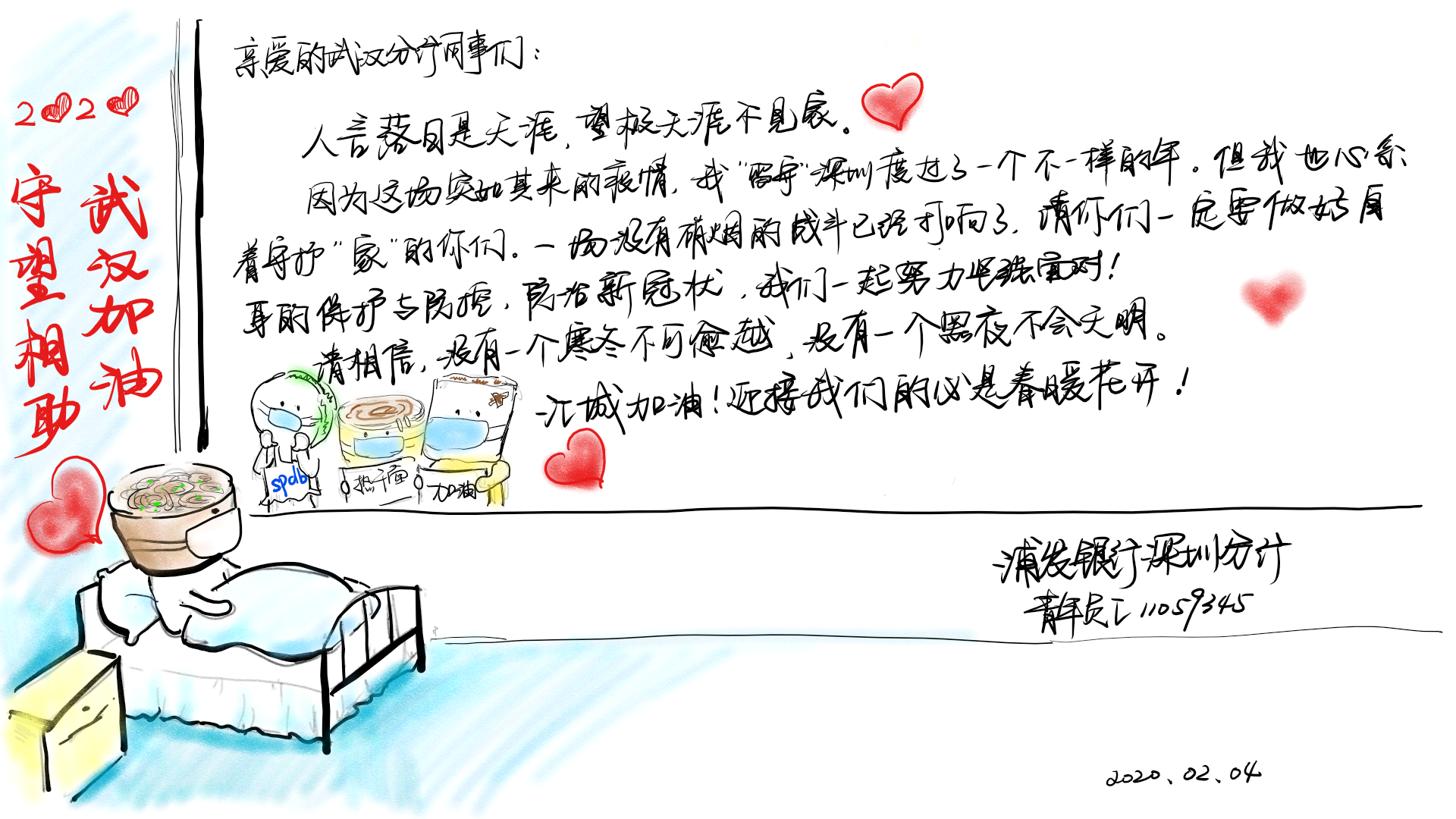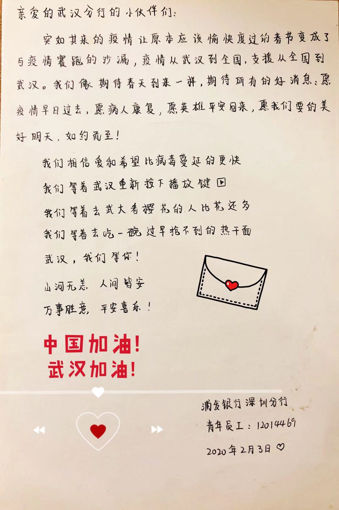 2月3日,浦發(fā)銀行深圳分行團委向全體青年員工發(fā)出了一封倡議書。在倡議書中,該行團委號召廣大團干部、團員青年立即行動,充分發(fā)揮黨的助手和后備軍作用,展現(xiàn)青年突擊隊作為,為堅決打贏疫情防控阻擊戰(zhàn)貢獻力量,并向青年提出三個要求:“堅定信心不迷茫,聽黨指揮勇?lián)敗薄ⅰ翱茖W(xué)防范不信謠,眾志成城控疫情”、“居家辦公不離崗,服從指揮勇?lián)敗?。當日,浦發(fā)銀行深圳分行發(fā)起了給武漢分行同事寄送家書的活動,該行全體青年手寫家書,圖文并茂、紙短情長,表達了對疫區(qū)“戰(zhàn)友們”最深切的關(guān)愛和鼓勵,身體力行做好他們堅強的后盾。