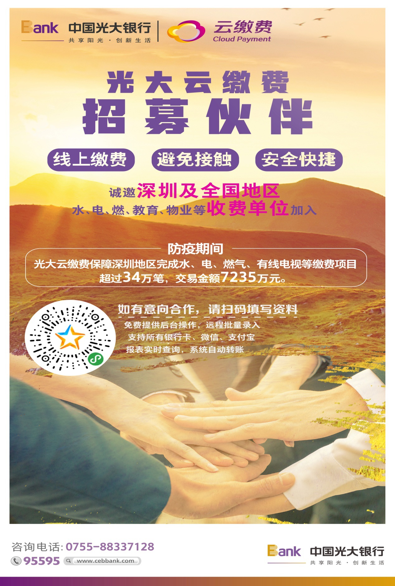 見圳客戶端·深圳新聞網(wǎng)2月26日訊 守望相助,共克時艱。面對新型冠狀病毒疫情防控的緊張形勢,為有效阻斷病毒傳播渠道,光大銀行深圳分行積極響應(yīng)國家號召,充分發(fā)揮云繳費線上便民繳費服務(wù)優(yōu)勢,全力保障全國,特別是重點地區(qū)水、電、燃等主要生活繳費線上通道穩(wěn)定暢通運行,足不出戶,完成各類繳費,最大限度降低了居民的出行風險,全面助力打贏“防疫”阻擊戰(zhàn)。
