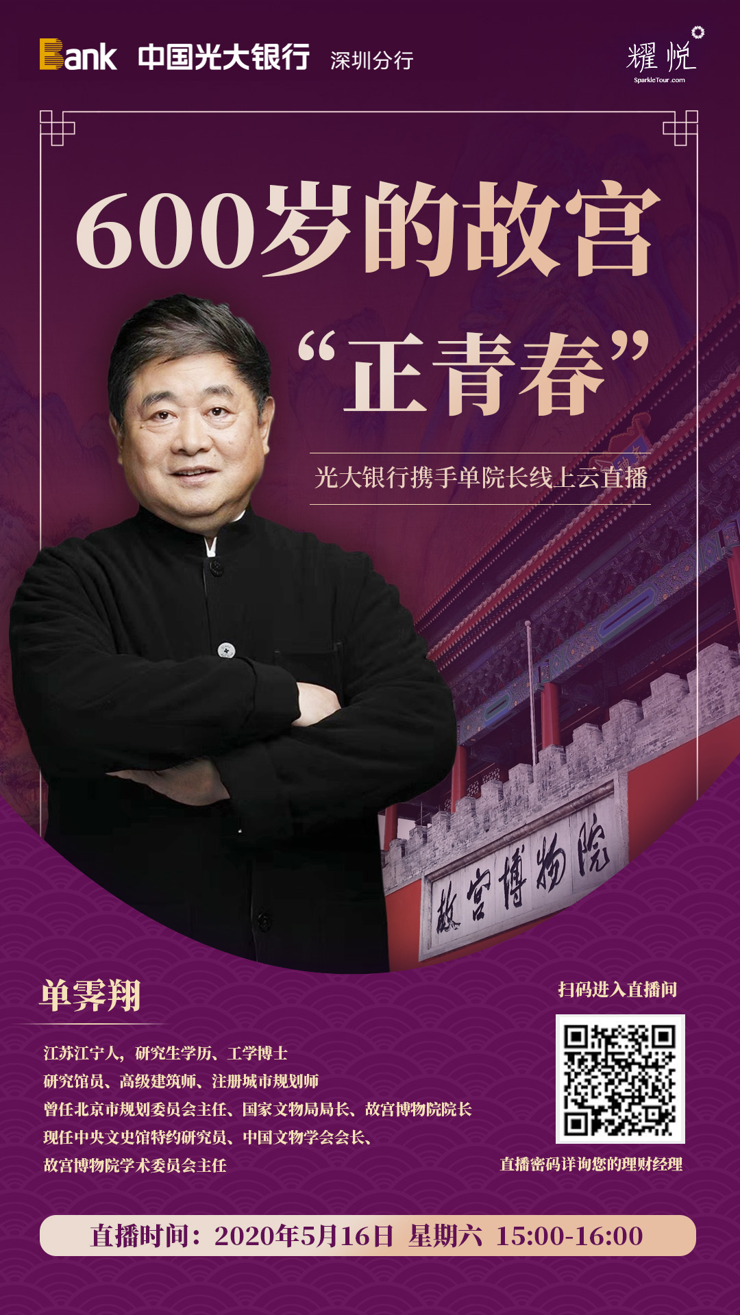 深圳新聞網(wǎng)2020年5月15日訊 他要來了,帶著600歲故宮的青春故事來了,來到《光大銀行“開講啦”!》第十二期。為了回饋客戶,讓廣大客戶更深入體會到故宮之美,光大銀行深圳分行特邀請?jiān)蕦m博物館單霽翔院長,于5月16日(周六)下午3點(diǎn)-4點(diǎn)線上開講精彩課程《600歲的故宮“正青春”》,讓參與者從多個角度體驗(yàn)傳統(tǒng)文化之美。