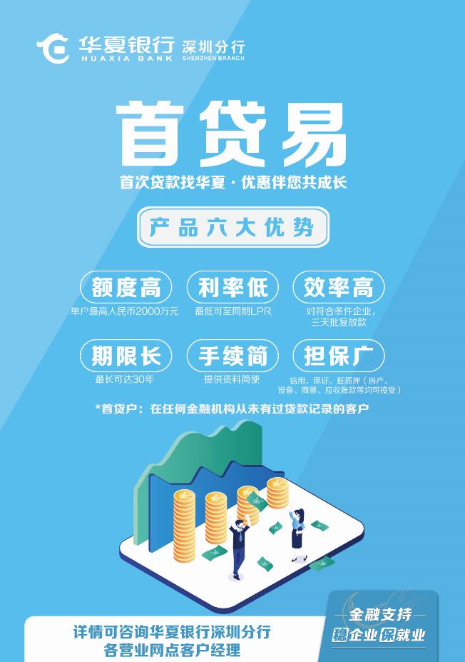 為滿足廣大中小微民營企業(yè)的資金需求,加大信貸投放精準(zhǔn)滴灌,華夏銀行創(chuàng)新推出“首貸易”產(chǎn)品,向首貸戶(是指在任何金融機(jī)構(gòu)從未有過貸款記錄的客戶)承諾“首次貸款找華夏,優(yōu)惠伴您共成長”的全方面、定制金融服務(wù)?!笆踪J易”產(chǎn)品具有“六大突出優(yōu)勢(shì)”,額度高、利率低、效率高、期限長、手續(xù)簡、擔(dān)保廣。