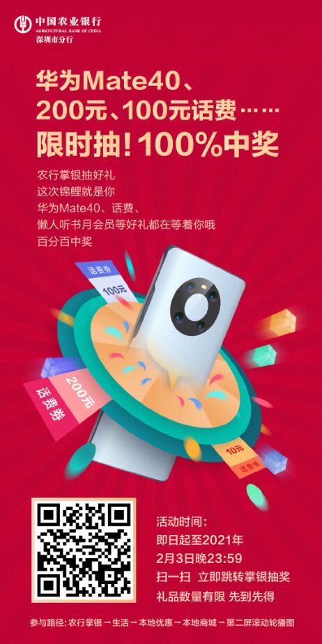 深圳新聞網(wǎng)·見圳客戶端2021年1月2日訊 農(nóng)歷新年越來(lái)越近,農(nóng)行掌銀讓您足不出戶,動(dòng)動(dòng)手指抽好禮,這次錦鯉就是你!華為Mate40、200元話費(fèi)、100元話費(fèi)等好禮,限時(shí)抽。