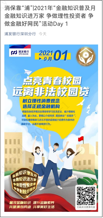 9月1日,也是校園開學的日子。開學的第一天,浦發(fā)銀行深圳分行特別推出“點亮青春校園遠離非法校園貸”日歷宣傳海報,并在官方微信公眾號進行轉(zhuǎn)發(fā)宣傳,同時在46家網(wǎng)點營業(yè)大廳顯示屏播放,重點傳播校園貸金融知識,提醒學生人群,合理消費,遠離不良網(wǎng)貸行為。據(jù)悉,該行將在九月每個工作日持續(xù)發(fā)布消保宣傳日歷,常態(tài)化長效推進金融知識普及月宣傳活動的開展。