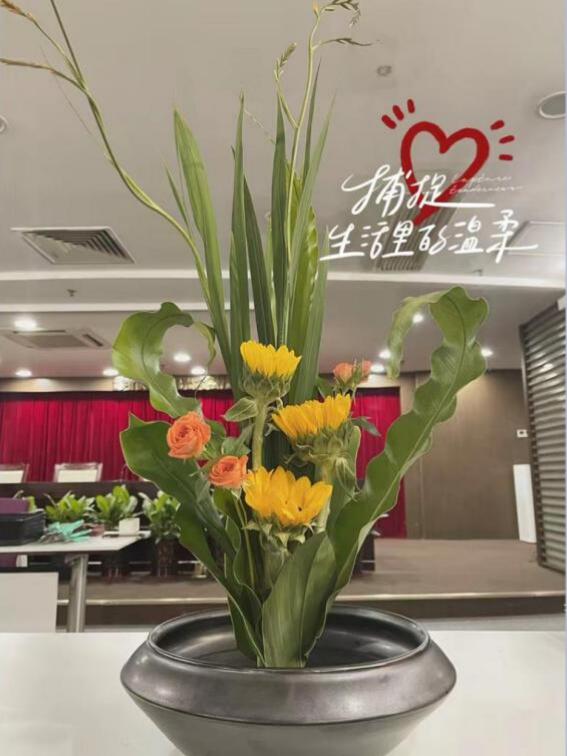 活動(dòng)現(xiàn)場,馮老師詳細(xì)介紹了傳統(tǒng)花藝的歷史文化、插花造型、色彩搭配、器具應(yīng)用等基礎(chǔ)知識,從花語寓意、花材修剪、構(gòu)圖等方面深入淺出的講解插花的要點(diǎn)。在悠然的花香浸染間,輕柔的音樂熏陶中,大家按照馮老師展示的步驟,將花朵、樹葉精心剪裁、混搭、點(diǎn)綴成束,將一朵一朵鮮花、綠葉錯(cuò)落有致地插在花盆中里,普通的花葉、枝條,經(jīng)過大家精巧的修飾與加工之后,變成了令人賞心悅目的藝術(shù)品。整個(gè)會(huì)場花香四溢,歡聲笑語,充滿了輕松歡快的氛圍。