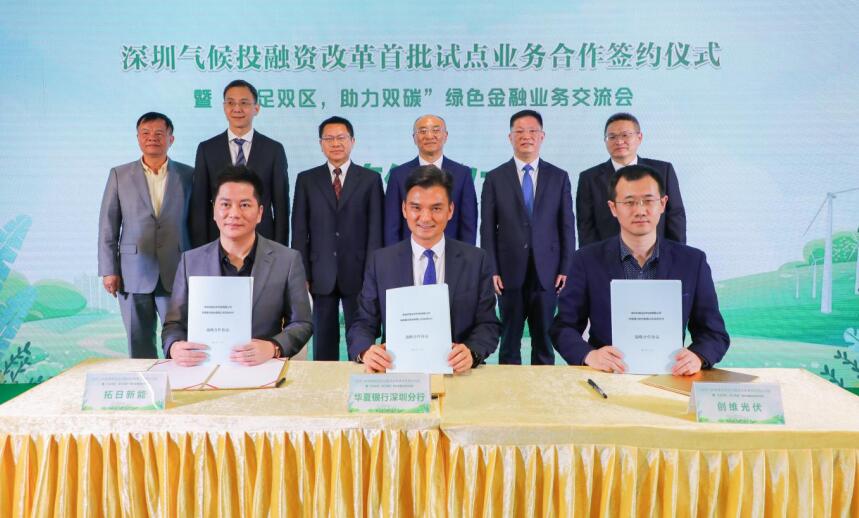 在與會領(lǐng)導(dǎo)嘉賓的共同見證下,華夏銀行深圳分行分別與深圳市創(chuàng)維光伏科技有限公司、深圳市拓日新能源科技股份有限公司簽署了《深圳氣候投融資改革首批試點業(yè)務(wù)合作協(xié)議》。