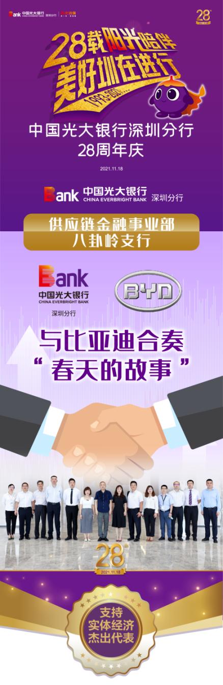 作為光大銀行深圳分行首批成立的支行之一,八卦嶺支行是服務比亞迪的“第一線”。一個個服務實體經(jīng)濟、相伴成長的動人故事,成為八卦嶺支行代代相傳的寶貴財富。在深圳分行28周年“十大最美光陰故事”評選中,供應鏈金融事業(yè)部與八卦嶺支行榮獲支持實體經(jīng)濟杰出代表。