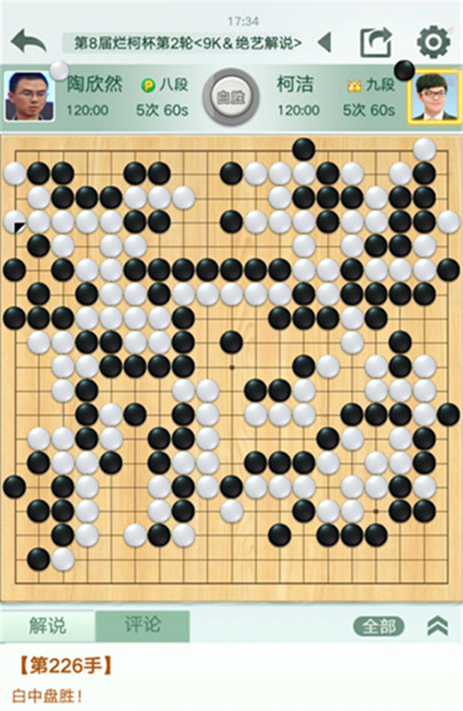 本局陶欣然執(zhí)白后行,以極具觀賞性的大模樣開局,將局面導(dǎo)向他擅長的進(jìn)攻節(jié)奏。在中腹的作戰(zhàn)中,白方判斷精準(zhǔn),棋感敏銳,保持了很高的AI吻合度,一直良好地把握著局面。行至后半盤,黑方柯潔開始了他擅長的逆風(fēng)攪局,多處挑起劫爭。好在陶欣然未出大錯(cuò),在混亂的局面下穩(wěn)住了局勢(shì),保持優(yōu)勢(shì)直至226手黑方投子認(rèn)負(fù)。