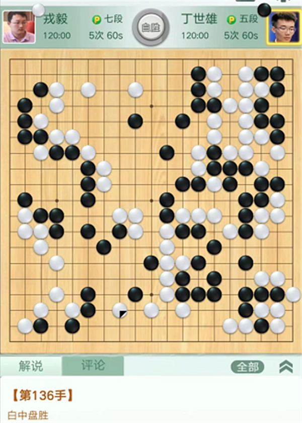 第三臺慢棋,由深圳隊戎毅七段執(zhí)白對陣衢州隊丁世雄五段。開局右下角變化黑棋虧損。之后白棋右上角試應(yīng)手時,黑棋選擇脫先吃白中間殘子失誤。白棋棄掉幾子在右上黑空先手活出,大幅領(lǐng)先。之后白棋安全運轉(zhuǎn)直至終局,戎毅執(zhí)白中盤勝丁世雄。