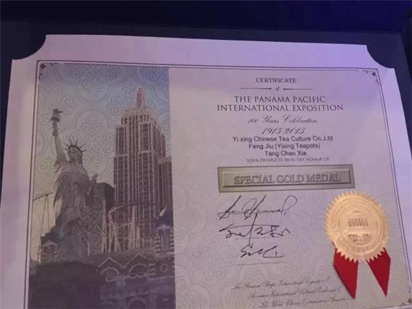 據(jù)悉,此次在美國舉行的巴拿馬太平洋萬國博覽會百年慶大會上,共有來自全球30多個(gè)國家5000個(gè)品種參展,盛況空前,共評出3個(gè)特等獎、10個(gè)金獎以及銀獎、銅獎、優(yōu)秀獎若干。唐朝霞的作品能夠獲得兩項(xiàng)大獎,無疑是宜興紫砂的杰出代表。百年之前的1915年,宜興紫砂在首屆巴拿馬太平洋萬國博覽會上也曾讓世界為之傾倒,程壽珍的“掇球壺”、范大生的“大柿子壺”獲頭等獎。1933年,在美國芝加哥萬國博覽會上,宜興紫砂再次轟動世界,范大生的“合棱壺”、俞國良的“四方傳爐壺”、汪寶根的“東坡壺”、朱可心的“竹節(jié)鼎”喜獲金獎。國人眾所周知,茅臺酒是榮獲巴拿馬萬國博覽會金獎一舉成名的,而今,宜興唐朝霞的《蜂菊》壺獲得本次活動的特別金獎、《丹鳳朝陽》壺獲得金獎,喻示著:唐朝霞的作品不僅走出了宜興、走到深圳,還走出了國門、走向了全世界!
