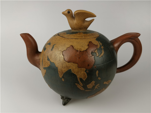 再說第二件,《世界和平壺》的回歸。2020年6月,唐朝霞老師的愛人韋強(qiáng)先生正在深圳商會開會。其間,一次會議結(jié)束后剛回到酒店時(shí)手機(jī)響起!一位美國的朋友電話給他告訴他一個(gè)天大的喜訊:在日本發(fā)現(xiàn)了唐朝霞爺爺唐鳳芝的傳奇作品“世界和平壺”。韋強(qiáng)介紹說,1943年,因?yàn)樘气P芝是民國時(shí)的紫砂大師,民國政府委托唐鳳芝先生特制了“世界和平壺”,隨后,由宋美齡女士在赴美國演講時(shí)一起帶了過去,象征著世界和平之意!想不到時(shí)隔80年,竟然在日本出現(xiàn)了。韋強(qiáng)說,看到實(shí)物照片時(shí),真的太激動了!此前,他們在家里只看到過爺爺設(shè)計(jì)的圖紙,從沒看到過實(shí)物,接到這意外訊息真的是驚喜萬分!真是難以入眠!通過一系列的協(xié)調(diào),日本的藏家愿意轉(zhuǎn)讓,讓激動的心更加興奮了,立即訂了機(jī)票,著手辦理“回歸事宜”。當(dāng)他終于在海關(guān)拿到了這件作品,包裝非常完好,便緊緊的抱在胸前:飄泊海外80年的“思念”終于落定了,爺爺唐鳳芝的“世界和平壺”終于回家了。韋強(qiáng)說:當(dāng)時(shí)的心情無法用言語形容!只覺得天空格外清新、陽光格外燦爛!