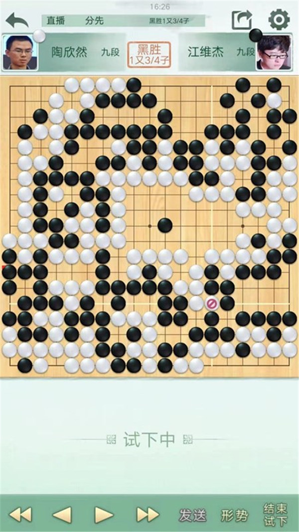 二臺陶欣然執(zhí)白主將對陣世界冠軍江維杰。開局白有利,左邊白棋進(jìn)攻黑棋時候手法過于松緩,局面接近。之后白棋中央又出現(xiàn)緩手黑棋領(lǐng)先。之后右上白棋主動開劫,但是劫材處理失誤,局面惡化。之后黑棋稍有退讓保持小勝。
