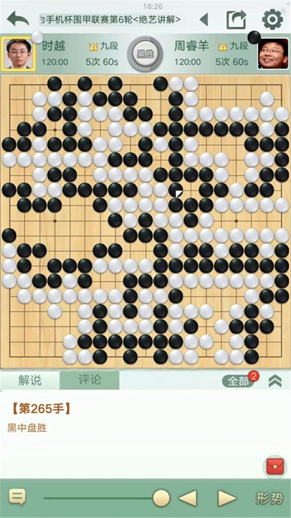 四臺時越執(zhí)白對陣世界冠軍周睿羊。中盤白棋侵消黑棋左上大模樣,黑棋付出很大代價強(qiáng)殺形成打劫。白棋劫爭中不夠細(xì)膩沒有擴(kuò)大戰(zhàn)果而是聯(lián)絡(luò)成活,局面白稍有利。之后白棋左下連續(xù)下出緩手后局面接近。右下角黑棋二路夾試白應(yīng)手時白棋嚴(yán)重失誤,被黑棋奪走角地后局勢逆轉(zhuǎn)。