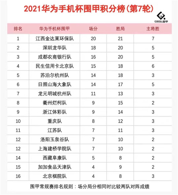 見圳客戶端?深圳新聞網(wǎng)2021年6月8日訊(記者周錦春)華為手機(jī)杯男子圍甲聯(lián)賽16支隊(duì)伍今日繼續(xù)在浙江長興捉對進(jìn)行第七輪的廝殺。繼第二階段首輪失利后,今日的深圳龍華隊(duì)似乎找回了第一階段五連勝的感覺,以3:1戰(zhàn)勝北京棋院隊(duì),從昨天的積分榜第三位前進(jìn)了一步,重拾升勢位居第二。江西隊(duì)依然神勇,以3:1擊敗洛陽隊(duì),繼續(xù)領(lǐng)跑積分榜。