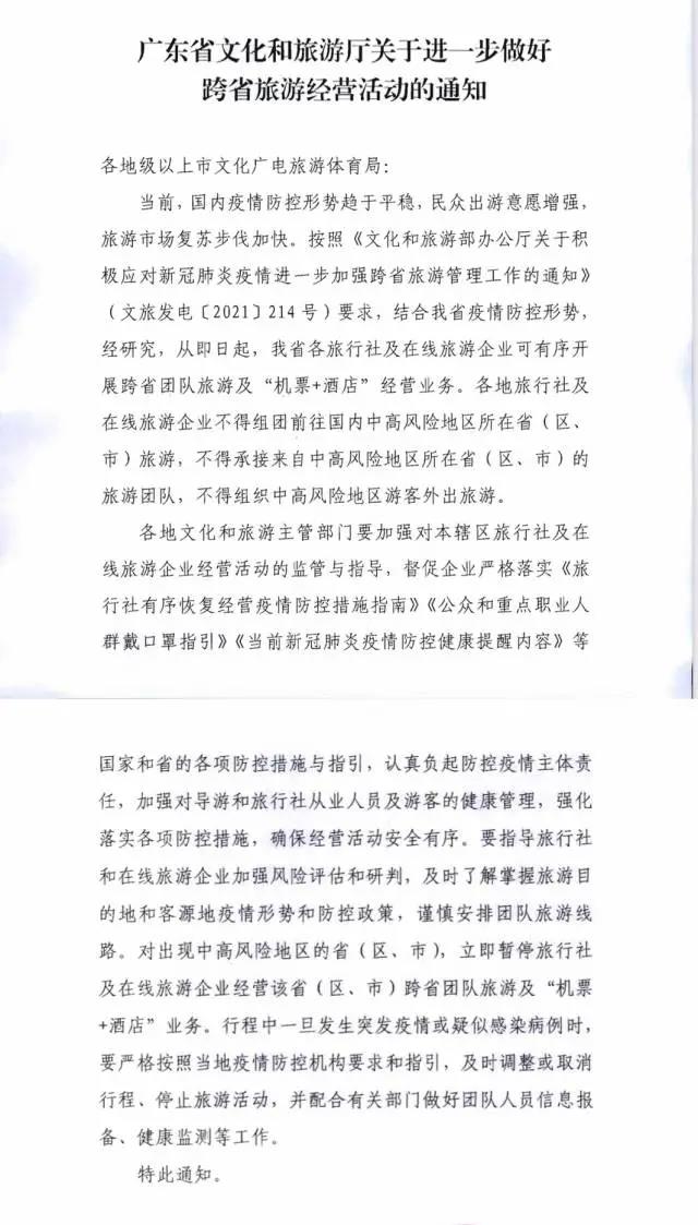 深圳新聞網(wǎng)2021年8月25日訊 (記者 田志強)廣東省文化和旅游廳今日發(fā)布《關(guān)于進一步做好跨省旅游經(jīng)營活動的通知》,通知明確:從即日起,我省各旅行社及在線旅游企業(yè)可有序開展跨省團隊旅游及“機票+酒店”經(jīng)營業(yè)務(wù)。各地旅行社及在線旅游企業(yè)不得組團前往國內(nèi)中高風險地區(qū)所在省(區(qū)、市)旅游,不得承接來自中高風險地區(qū)所在?。▍^(qū)、市)的旅游團隊,不得組織中高風險地區(qū)游客外出旅游。