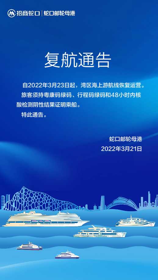 讀特客戶端 ·深圳新聞網(wǎng)2022年3月21日訊(記者 田志強)記者從招商蛇口郵輪母港獲悉,自3月23日起,灣區(qū)海上游航線恢復(fù)運營。搭乘該航線的旅客須持粵康碼綠碼、行程碼綠碼和48小時內(nèi)核酸檢測陰性結(jié)果證明乘船。