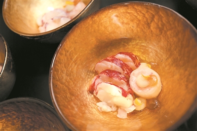 頭盤 “荷塘魚趣”,主角黃花魚來自世界第三大江——長江。步步生蓮是東方禪意,蓮子依依是情誼,蓮藕結(jié)結(jié)是路路通達(dá),Alvin Leung此次演繹的中式料理充滿東方元素,表達(dá)的是和諧交融。主菜“日式鮮味香烤和牛”是日本主廚Hisamitsu Hataji 之作,他用創(chuàng)新手法融入經(jīng)典的日式料理中,表達(dá)一年四季食材與味道的關(guān)系,這是關(guān)于美食的光陰的故事。甜品出自Clement之手,是晚宴甜蜜的句號。