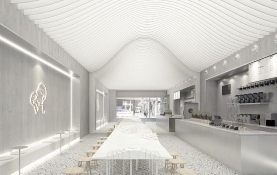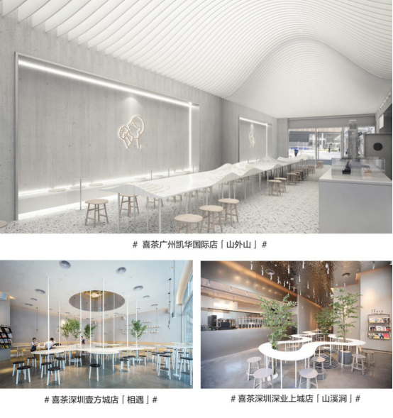 店中的桌子做成浮云形狀,山成為桌子的一部分,與天頂?shù)纳叫伟咨⌒雾斉镞b相呼應,“山外山”主題呼之欲出。喜茶·山外山的設計靈感來源于兩幅古畫——《春山瑞松圖》和《溪山行旅》。設計師把畫中的“山峰”感融入店內,現(xiàn)代化的同時富有詩意。讓茶客仿佛置身畫中,大夢一場,不知身在何方。