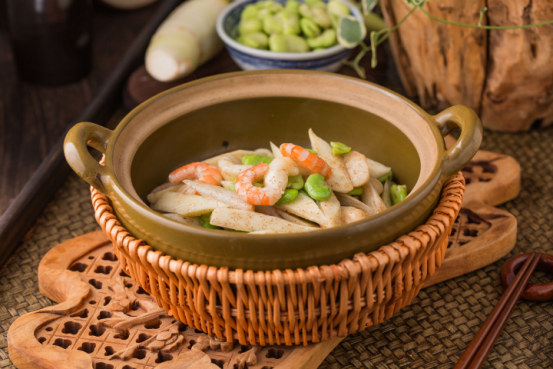 食材多來自水澤,藕帶、菱角、茭白、蠶豆瓣、大蝦仁,自制蝦醬爆炒起香,時蔬的白綠點綴蝦仁的淡粉,如青荷托芙蓉之色,砂鍋盛上,滋滋作響,讓人眼前浮現(xiàn)出“蛙聲喧夏夜,魚影動荷塘”的畫面。