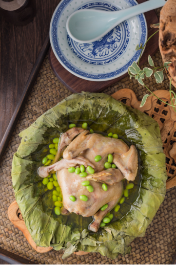 “池塘十里盡荷塘,姊妹朝來采摘忙,不摘荷花摘荷葉,飯包荷葉比花香?!鼻迥┟癯醯倪@首詞,表明了人們對用荷葉制肴的喜好。選用肉質細嫩的仔雞,以荷葉包裹蒸熟,松軟適口,呈現(xiàn)原汁原味的鮮美,融合荷葉的幽幽清香,細細品味,仿佛回到夢里水鄉(xiāng)。