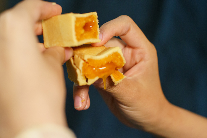 月餅有流心餡,鳳梨酥吃過流心的嗎?徐福記·呈味空間的咸蛋黃流心酥,跟傳統(tǒng)月餅有不同的酥軟的酥皮,吃起來口感綿密而不膩,是因?yàn)樗制だ锛尤肓四滔愦己竦陌布腰S油,烘焙界頂尖認(rèn)證的黃油,聞起來還有淡淡的奶香。內(nèi)餡是有香濃細(xì)滑的奶黃,里層藏著有流沙般的咸蛋黃,輕輕一咬,入口松化,餡料如熔巖般流出,飽滿的流心一下子就迸發(fā)喉嚨,軟諾的口感讓人欲罷不能,吃完還想吃。俗話說流心更用心,富到流油好意頭,今年來點(diǎn)不一樣的“暴富“!