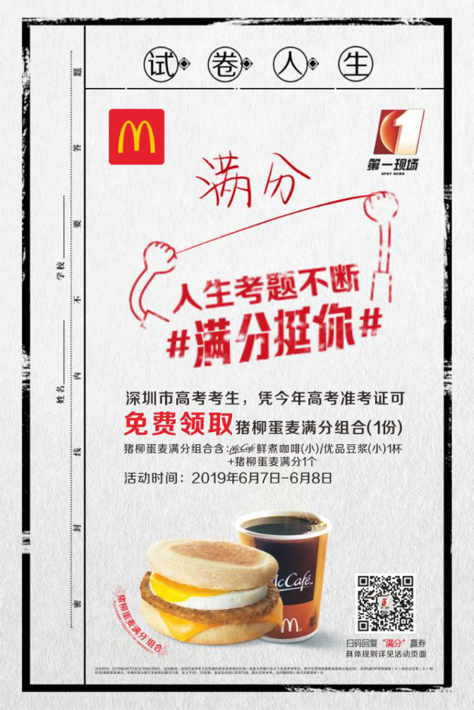 麥當(dāng)勞早餐攜手百萬(wàn)網(wǎng)友,預(yù)祝高考考生“滿(mǎn)分”考試,以“滿(mǎn)分”的早餐,迎接每天“滿(mǎn)分”生活。