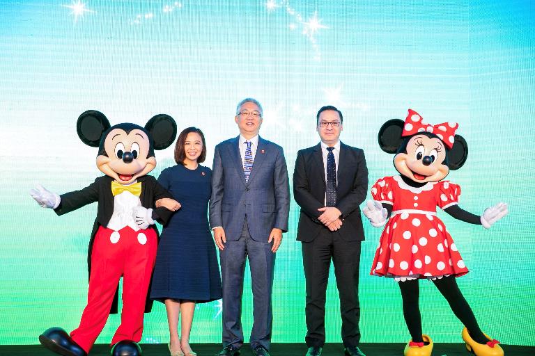 麥當(dāng)勞中國董事會主席張懿宸先生(中)、麥當(dāng)勞中國首席執(zhí)行官張家茵女士(左二)、迪士尼中國影業(yè)及品牌管理副總裁及總經(jīng)理徐隆立先生(右二)、米奇和米妮(左一及右一),共同見證合作