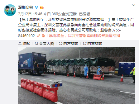 見圳客戶端·深圳新聞網(wǎng)2020年2月14日訊 2月12日下午約4時,深圳交警官方微博的一條消息牽動了深圳紅牛負責人張健明的心。該微博寫道:“急!暴雨將至,由于較多生產(chǎn)企業(yè)尚未復工,深圳交警在此緊急面向全社會征集雨棚的購買渠道,同時也接受社會團體捐贈?!?/span>
