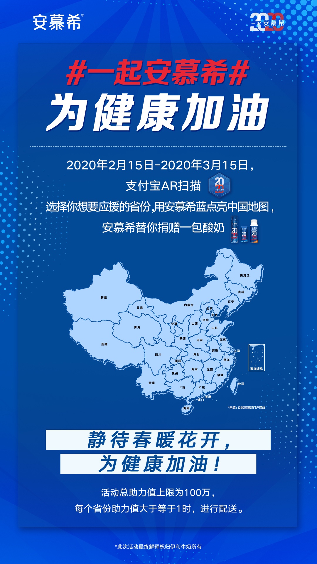 從2月15日起,安慕希發(fā)起“一起為健康加油”公益活動。消費者每成功通過支付寶AR掃描安慕希2020標志,并為支持的地區(qū)點藍,安慕希就會為抗疫一線人員送出安慕希產(chǎn)品,將愛心化為實際行動,為戰(zhàn)疫一線加油。