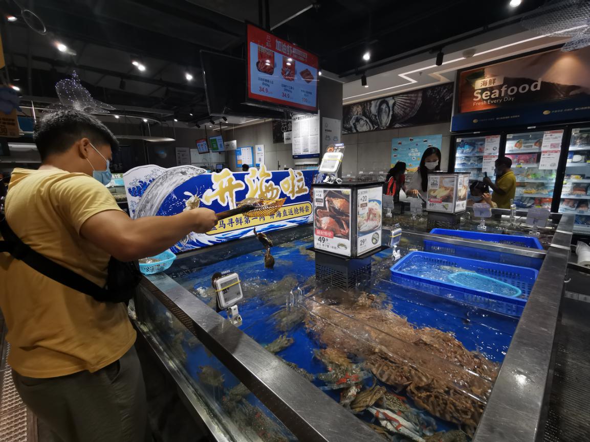 上市第一天,等待已久的市民們爭相購買嘗鮮。盒馬廣東門店的梭子蟹價格49.9元/斤,周日早上11點不到,第一波入缸的海鮮已經(jīng)被搶空,門店迅速補貨。