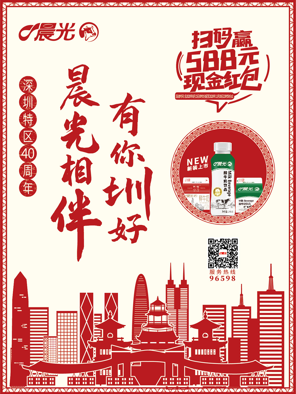 見(jiàn)圳客戶端·深圳新聞網(wǎng)2020年8月25日訊 作為深圳本土的國(guó)營(yíng)乳制品公司,晨光乳業(yè)以“深圳特區(qū)40周年,晨光相伴,有你圳好”為主題,致敬深圳經(jīng)濟(jì)特區(qū)建立40周年。作為一家“深圳老字號(hào)”品牌企業(yè),晨光乳業(yè)以40周年為契機(jī),推出全新升級(jí)包裝的240g酸牛奶飲品以及掃碼贏588元紅包等多個(gè)主題活動(dòng),在與千萬(wàn)深圳市民分享晨光40年的喜悅之情的同時(shí)共慶深圳經(jīng)濟(jì)特區(qū)成立40周年!