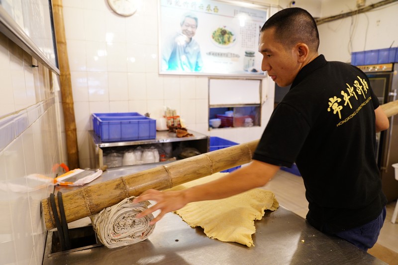 竹升面的精妙在于面味與堿水之間的平衡。堿水決定爽度,面粉決定了硬度和面香。堿水通常分3個度,19.5度、32度和52度,香港竹升面堿水通常用52度的,更為爽口,幾乎一咬即斷;斌哥用的是19.5度的堿水,表現(xiàn)的是恰到好處的爽。面粉必然要用高精面粉,但市面上的面粉那般多,要選合心水的實屬不易,他足足換了20多種,最后才選到合意的。25斤面粉,加上13斤鴨蛋,抽去蛋黃,只用蛋清,這也是增加面條爽度的法子,整個過程不加入一滴水。