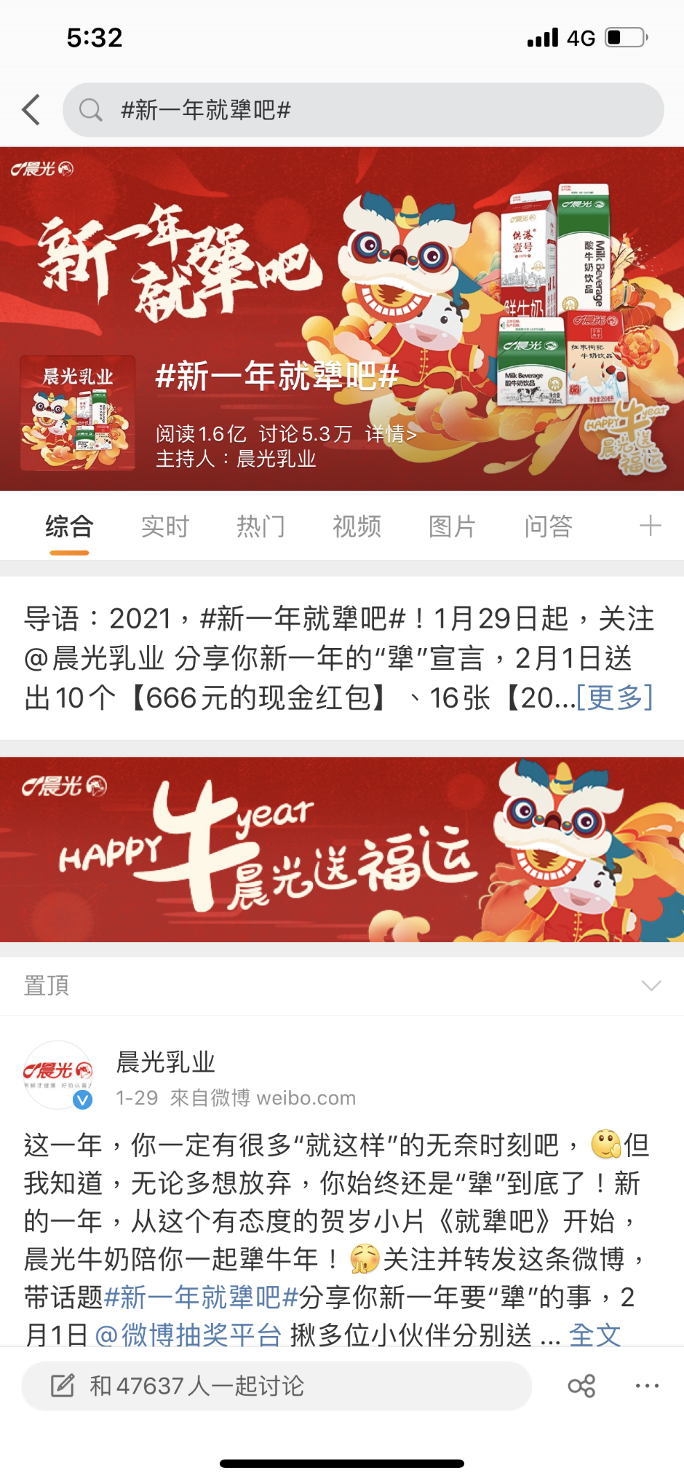 與此同時(shí),@晨光牛奶發(fā)起“犟到底”話題分享抽獎(jiǎng)活動(dòng),以“666元紅包”等“牛氣”獎(jiǎng)品刺激用戶參與話題討論。最終,話題 #新一年就犟吧#登陸微博熱搜榜第6位,僅兩日吸引1.5萬人參與討論,話題閱讀量突破1.6億。