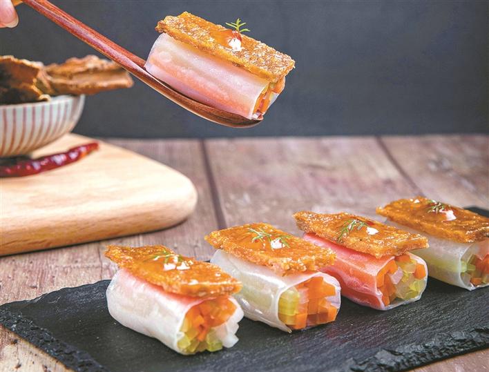粵菜師傅巧妙設(shè)計,將荔枝肉與蝦仁共燴——碧綠蝦仁炒荔枝肉。