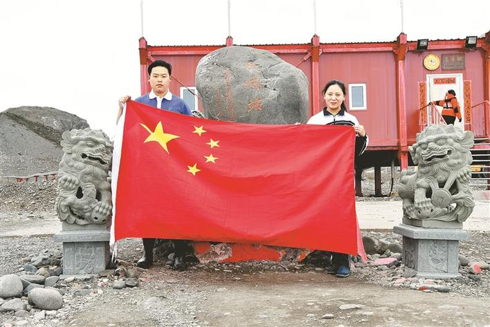 姚靜母子穿著深圳校服在南極長城站前合影。