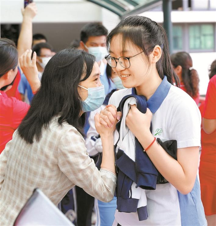 準(zhǔn)備進(jìn)入考場(chǎng)的育才中學(xué)考生與老師微笑握手,帶著老師的美好祝愿自信面對(duì)人生大考。深圳特區(qū)報(bào)記者周紅聲攝
