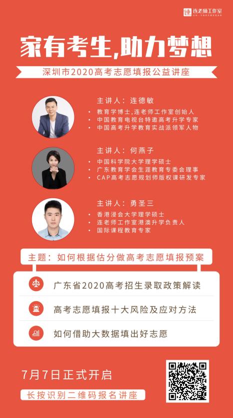 據(jù)悉,連老師工作室深圳市2020高考志愿填報(bào)公益講座接下來還會(huì)連續(xù)舉辦四場(chǎng)線下公益講座,講座均由連德敏博士主講,以“如何根據(jù)分?jǐn)?shù)做高考志愿填報(bào)預(yù)案”為主題,解讀廣東省2020高考招生錄取政策,分享高考志愿填報(bào)十大風(fēng)險(xiǎn)及應(yīng)對(duì)方法以及如何借助大數(shù)據(jù)填出好志愿等精彩內(nèi)容,幫助廣東省考生和家長更好的完成志愿填報(bào)。