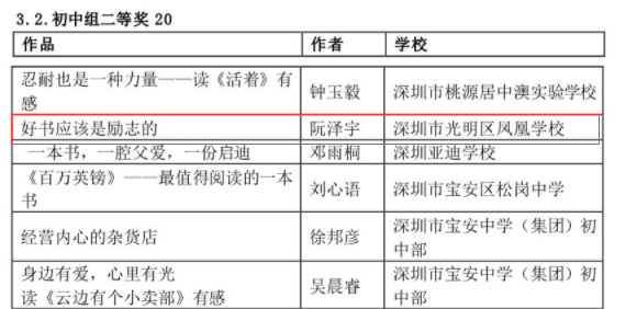 在深圳市4·23世界讀書日“探索閱讀新領(lǐng)域”創(chuàng)作比賽中學(xué)校榮獲優(yōu)秀組織獎,何雨晴、劉宥伯同學(xué)分別獲初小組二等獎、三等獎;阮澤宇、張雪怡同學(xué)分別榮獲初中組二等獎、三等獎。郭瑞芳老師榮獲優(yōu)秀指導(dǎo)老師獎,曾嵽稜、賴美君、李海亮榮獲優(yōu)秀組織老師獎。