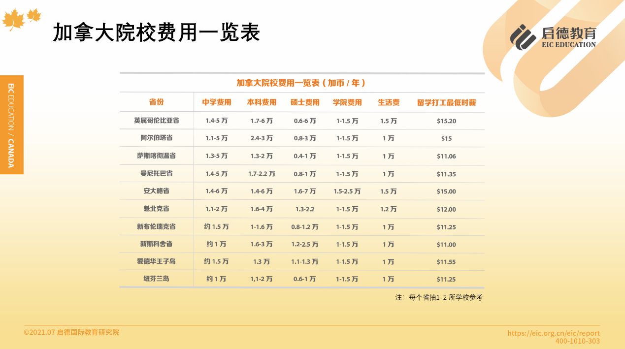 加拿大統(tǒng)計局?jǐn)?shù)據(jù)顯示,2019-2020學(xué)年加拿大國際留學(xué)生,本科平均學(xué)費(fèi)為29714加幣 /年 (同比上學(xué)年增漲7.6% ),約合16萬人民幣/年;碩士平均學(xué)費(fèi)水平為17744加幣 /年(同比上學(xué)年增漲4% ),約合10萬人民幣/年;生活費(fèi)1萬 -1.5萬加幣 /年,約合5.2萬-7.9萬人民幣/年,總留學(xué)費(fèi)用在美、英、澳、加四大熱門留學(xué)目的國中最低。此外,加拿大公立中學(xué)學(xué)費(fèi)、生活費(fèi)用共約14萬人民幣 /年,國際私立中學(xué)共約20萬人民幣 /年,私立本地精英中學(xué)共約20萬-28萬人民幣/年,私立貴族中學(xué)共約26萬 -40萬人民幣 /年。